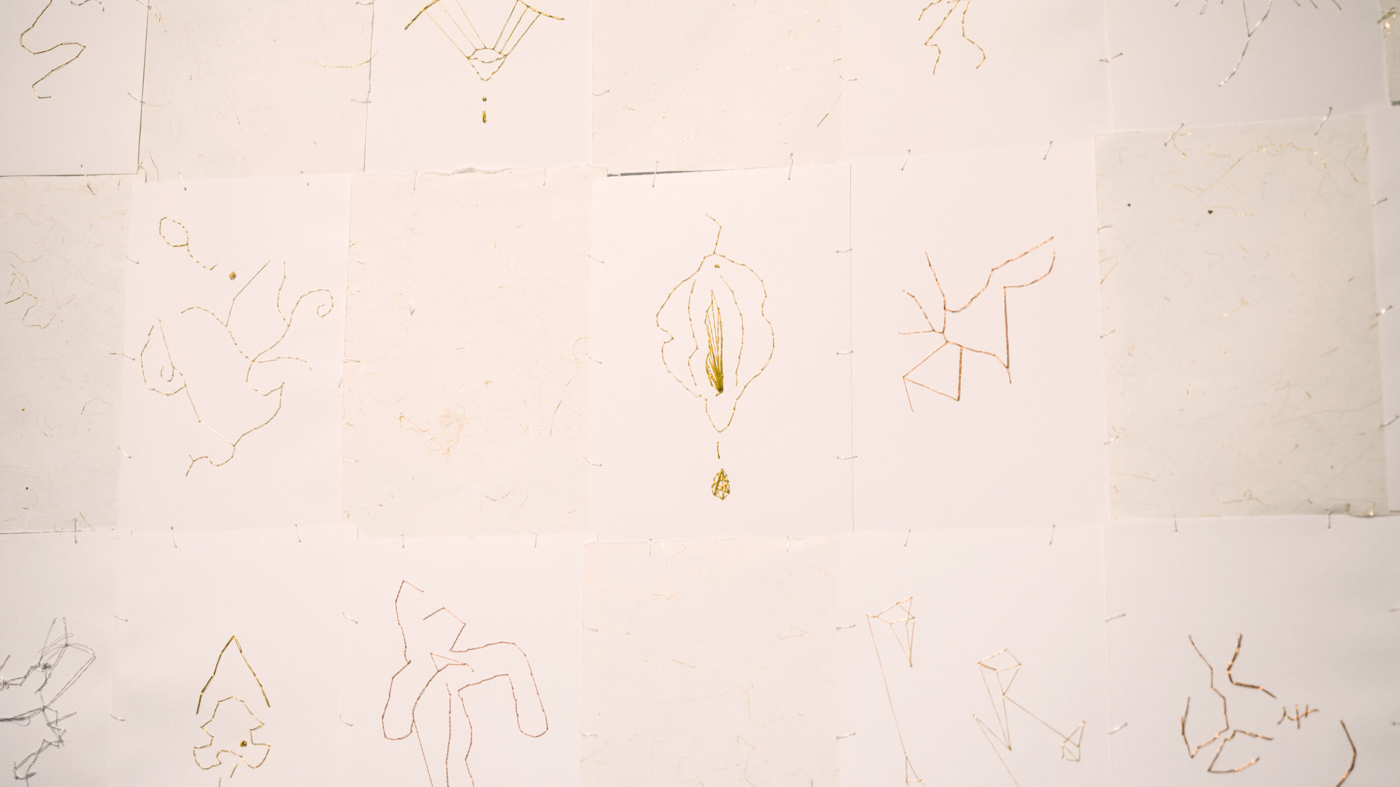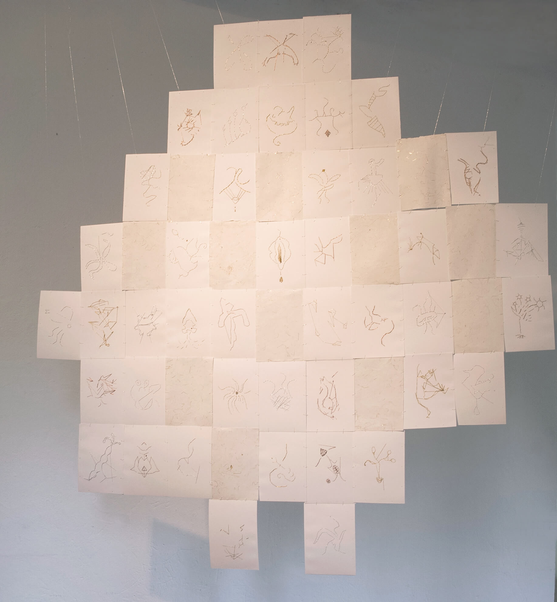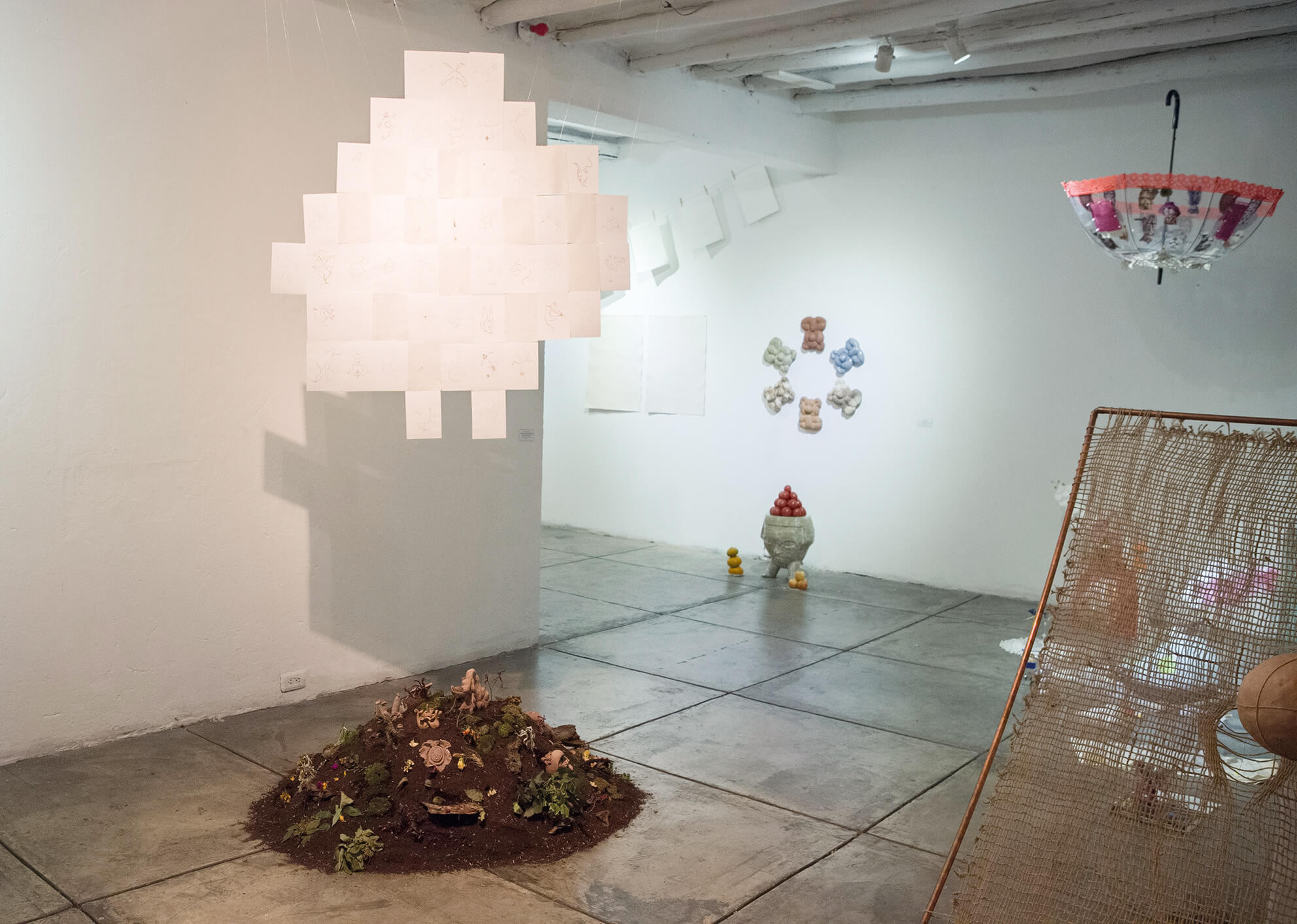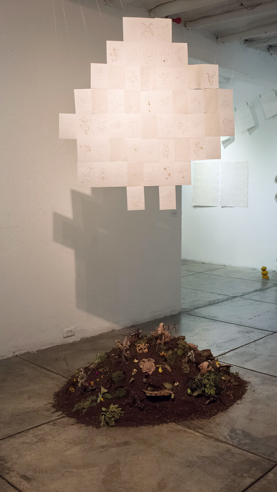 Éstos convivirán con una red de constelaciones fantásticas conformadas por una serie de papeles bordados, formando un universo de constelaciones que tendrá el carácter de ser flotante y podrá visualizarse en un radio 360, disolviendo de esta manera un anverso y un reverso. Esta cosmogonía, es ese cielo de constelaciones y esas cerámicas de la tierra que se vinculan, coexisten, se atraviesan y se modifican. La inmanencia es la que hace existir toda cosa al interior de toda otra cosa: todo está en todo. Es la relación que liga a las cosas entre ellas, la forma suprema de la sensibilidad que permite concebir al otro al mismo tiempo en el que el otro modifica nuestro modo de ser y nos obliga a movernos.