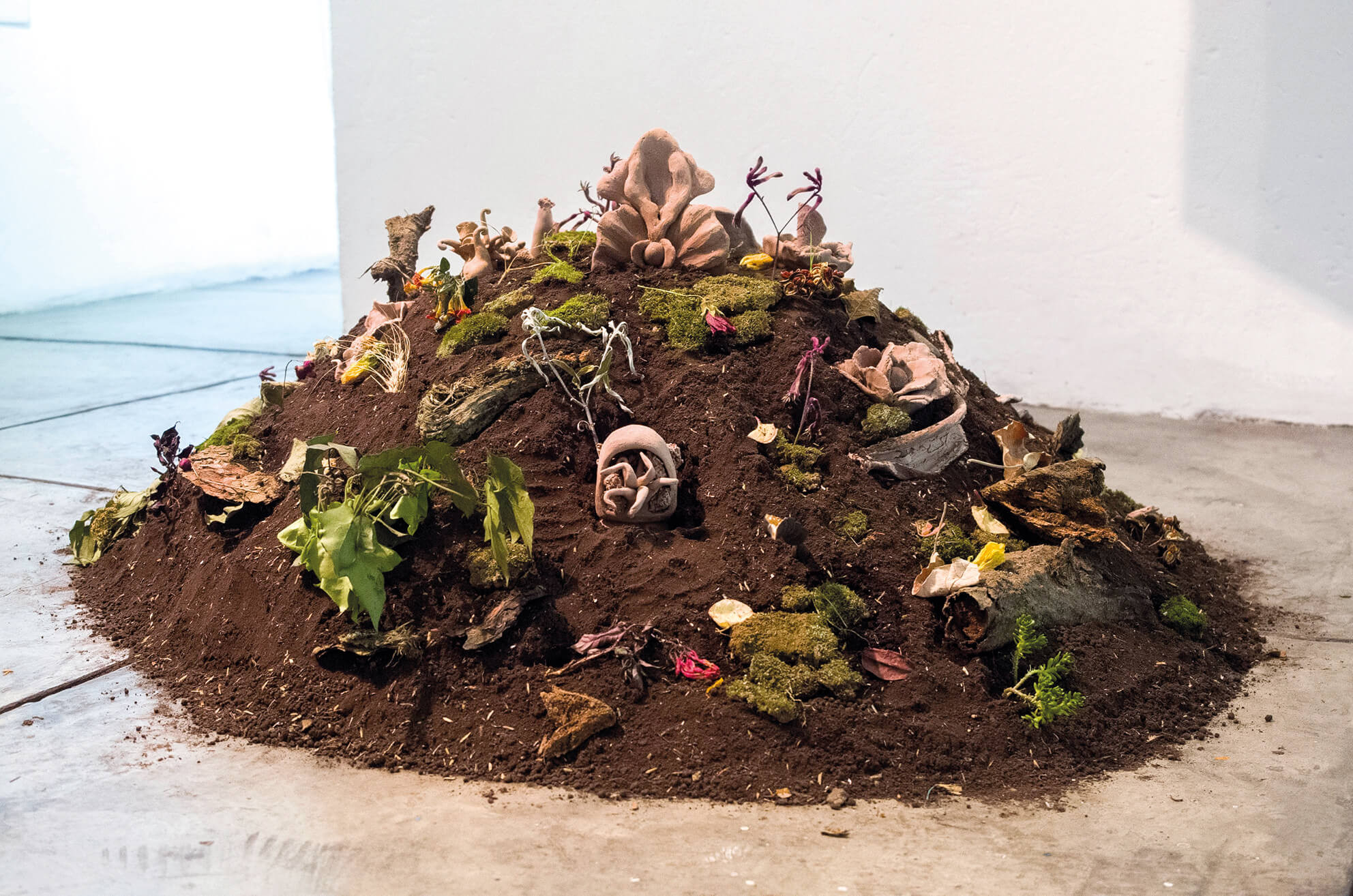 A partir de ello comencé a crear seres híbridos, interespecies a través del modelado de arcilla. Estos seres forman un ecosistema, un rincón habitable -la propia arcilla en crudo que proviene de la tierra- en donde coexistirán con la vitalidad de los otros elementos como plantas, musgos, hongos, y tierra. Durante el tiempo de exposición se transformarán, mutarán, deviniendo en otra cosa, según la propia fuerza vital y su entorno. Ese mismo entorno que en simultáneo habilita la vida de estos nuevos seres. El mundo es esa fuerza que transforma todo ingrediente en lugar y todo lugar en un elemento del mismo compuesto.